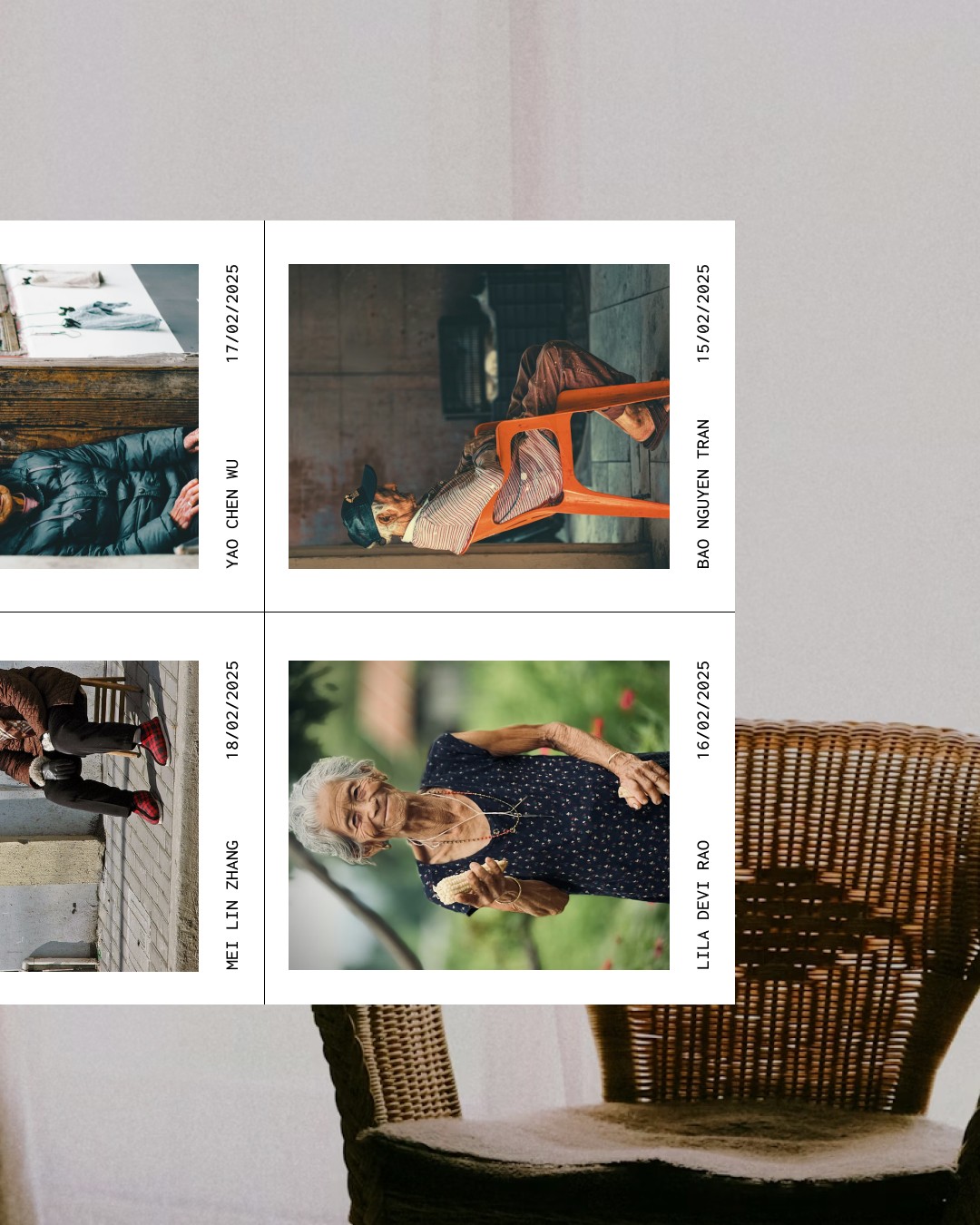 The long read is a more personal and detailed experience. Each one is released once a month and designed individually to fit the story. This article shares small stories from eight older people. Each person has their own voice, so I used different typefaces to reflect their character. When you click on a character, their story appears in a separate box. Their name is also set in a different type, giving each voice a unique presence. The layout becomes more expressive here, allowing the reader to slow down and connect more deeply.